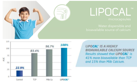 并且这是有实验证明的,巴塞罗那大学进行的关于膳食钙吸收的研究,对比了磷酸三钙(TCP)、 Lipocal®微囊化钙、乳钙三种不同钙的生物利用率: