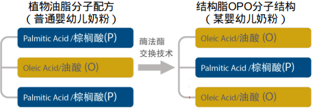 而随着人们对母乳脂肪认知的提升,发现母乳的脂肪和植物脂肪结构本身不一样,尤其体现在母乳乳脂最主要成分——甘油三酯结构上。这是因为脂肪酸在三酰甘油骨架上有着高度特异性的位置分布,分别为 sn-1,sn-2 和 sn-3 位。其中母乳中一种典型的甘油三酯是1,3-二油酸-2-棕榈酸甘油三酯,英文缩写为OPO,sn-1和sn-3位上为油酸(O),sn-2位是为棕榈酸(P)。