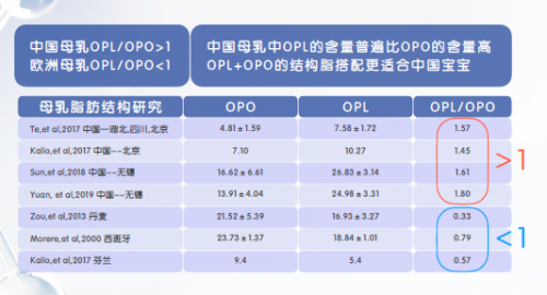 最近研究比较分析发现,中国妈妈母乳中除了OPO外,OPL(1-油酸-2棕榈酸-3亚油酸甘油三酯)的占比也很高,且基本上OPL的含量高于OPO。这与西方妈妈母乳中是不同的,她们乳汁中的OPO通常是大于OPL,这可能与遗传和饮食习惯有关。