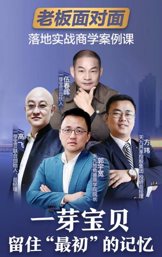 2021年5月21日,在天九共享集团倾力打造的直播节目《老板面对面》中,天九共享集团研究院联席院长郭宇宽邀请一芽宝贝项目联合创始人、总经理高飞、天九共享集团投研总经理方玮以及项目合作伙伴伍春晖,共同就“大数据铸就大产业”等话题展开热烈讨论,该节目通过天九共享集团自主研发的 天九老板云APP与平台上的百万企业家在线互动。