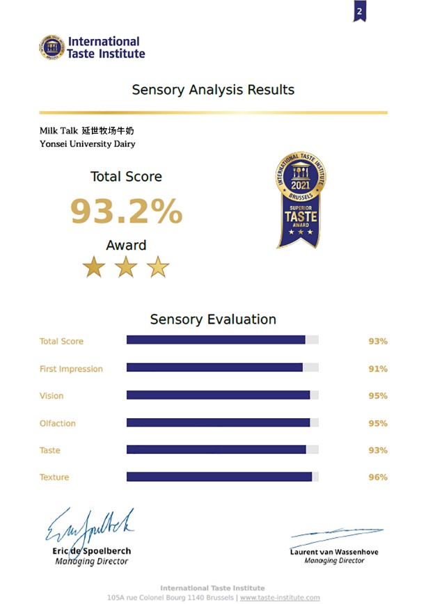 2021年5月26日, 延世牧场牛奶参加的国际顶级美味大赏公开了评鉴结果,延世牧场牛奶荣获最高三星奖章。