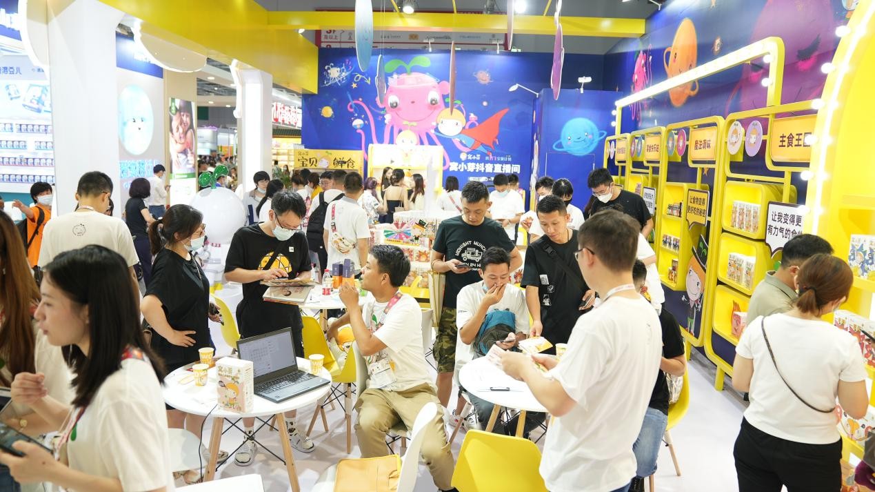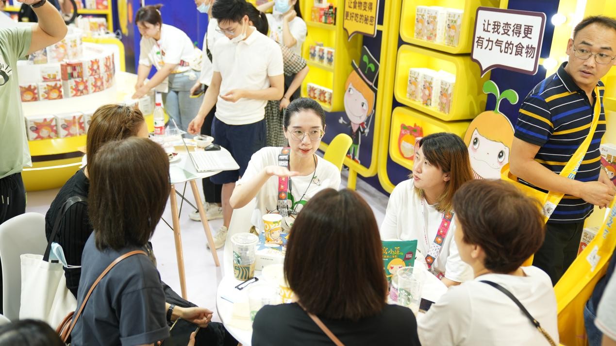 走近窝小芽展台,明黄色的背景墙加上随处可见的窝小芽IP形象,十分吸睛,展台内的游戏区、试吃区更是络绎不绝,并吸引了瑞雪妈妈、年糕妈妈等知名达人打卡。