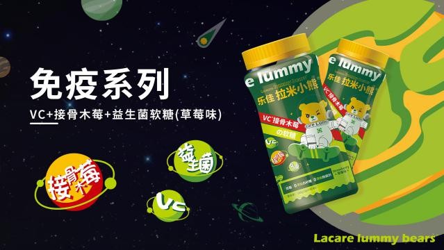 今年重新上市的乐佳拉米小熊软糖,有钙铁锌营养的健骨系列,和维生素C、接骨木莓、益生菌营养的免疫系列,外形包装时尚,Q弹口感,3岁以上人群可以放心食用。