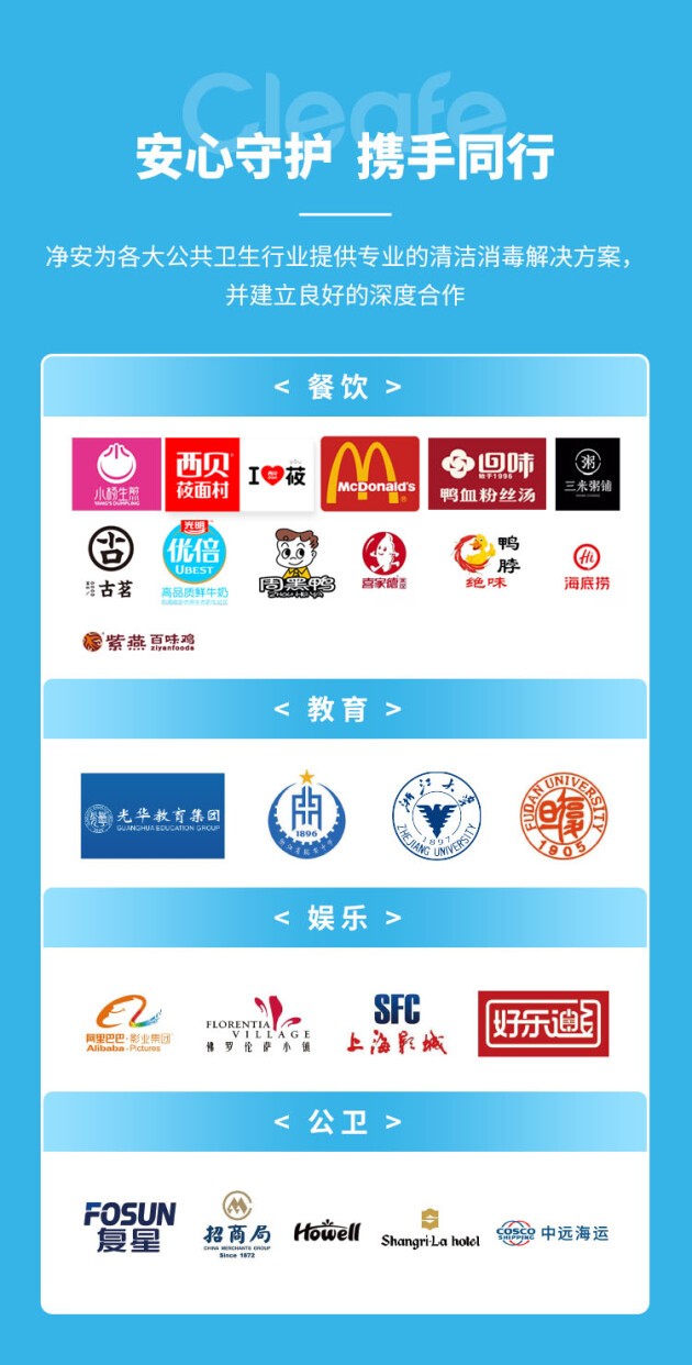 在各个领域,净安都尽己所能,提供优质的产品与完善的服务,以可执行的清洁消毒解决方案为准则,携手伙伴们,为大家打造洁净、安心的生活环境。