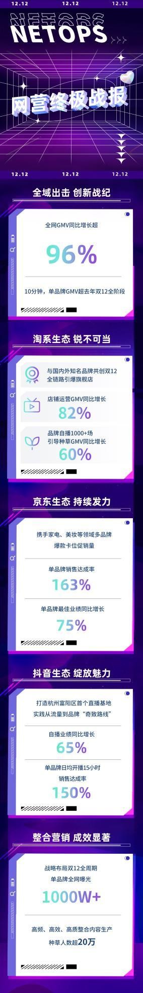 2021年双12购物狂欢节圆满收官,国内头部电商全域营销服务商“网营科技”晒出终极战报,用实力再次刷新战纪,彰显其赋能品牌强劲增长综合能力。战报数据显示,本次双12年终盛典,网营科技核心领域业务增势迅猛,全网GMV同比去年增幅超96%;开售10分钟,单品牌GMV超去年双12全阶段。