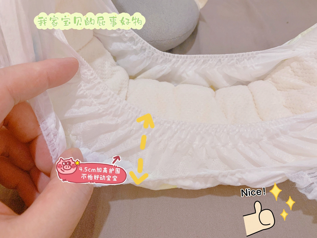 其次是这个拉拉裤的边边可以轻柔包裹着宝宝的小肚子,一点不勒,还超级防漏!像我家那位爱动宝宝,用它也没有出现漏液的情况,一个大写的OK!睡得超舒适!