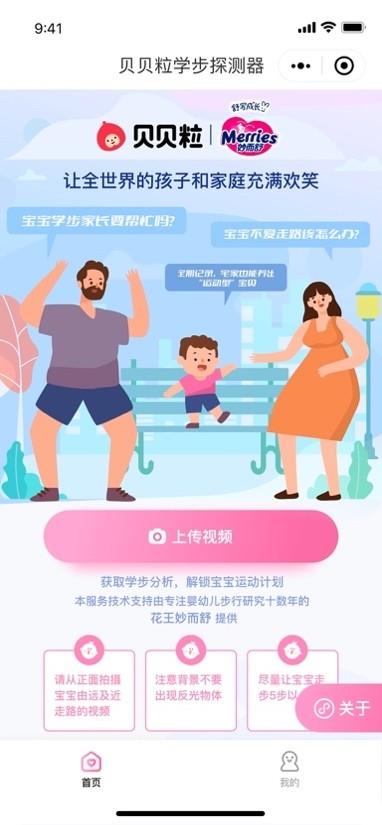秉承"让全世界的孩子和家庭充满欢笑"的愿景,上海万粒网络科技有限公司与花王研发团队、花王妙而舒品牌携手,针对处于学步期的中国宝宝和育儿家庭,推出了微信小程序——“贝贝粒妙妙宝宝学步助手”,并于2022年7月底正式开放使用。拍摄上传一段宝宝走路的视频,该微信小程序就能生成一份宝宝当前学步阶段的分析报告。