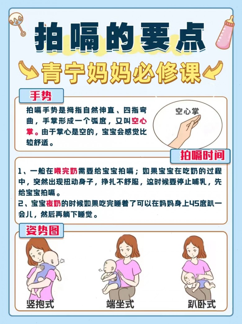 如果宝宝胀气了,最常见的护理方法是做排气操、拍嗝: