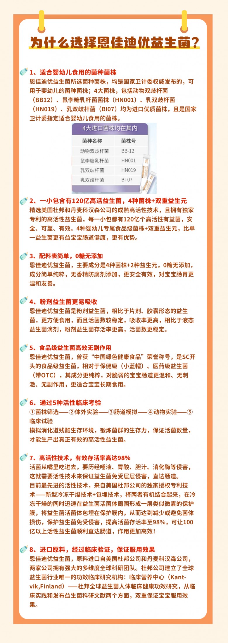 1、从美国杜邦和丹麦科汉森进口4种优质菌株,对宝宝胀气、积食、消化不良、便秘、腹泻等常见肠胃问题有非常好的预期效果;