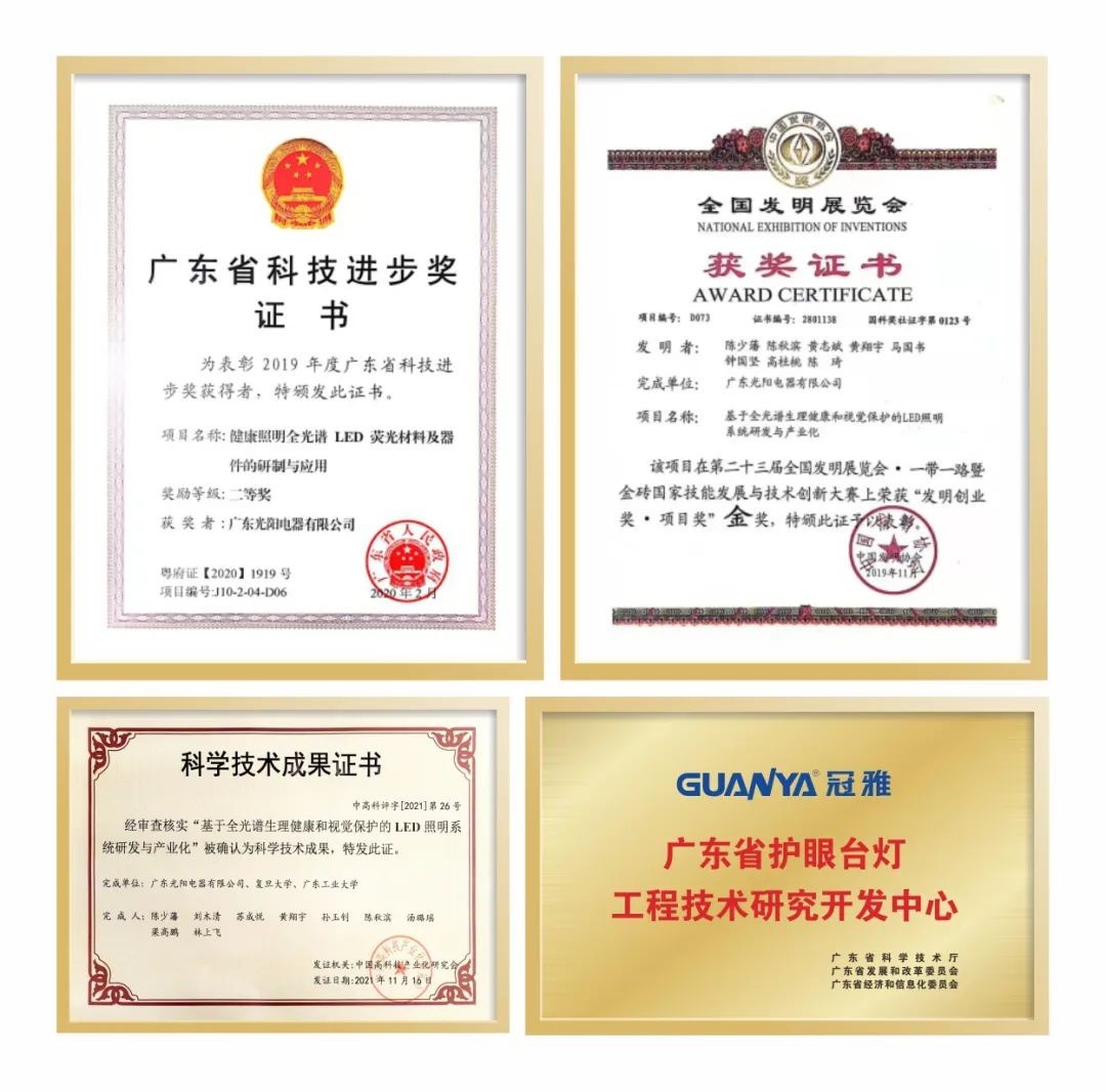 冠雅照明于2010年荣获“广东省工程技术研究开发中心”、广东省首批“专精特新企业”、并先后获得“广东省科技进步奖二等奖”、“中山市创新标杆企业”、2023年荣获广东省光电技术协会科学技术奖的技术发明奖特等奖等荣誉。
