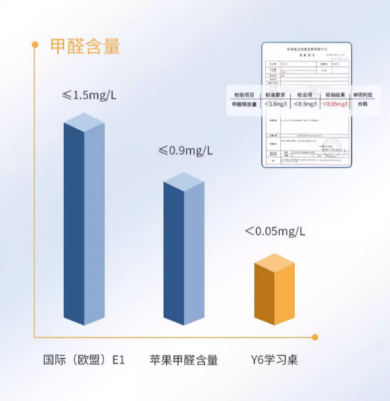 光明园迪Y6学习桌不仅品质过硬,安全环保也做到极致。Y6系列学习桌通过专业检测,甲醛含量≤0.05mg/L,选优于国际E1及日本F4星际检测标准,光明园迪的近0甲醛,无需散味,贴近自然纯净呼吸。