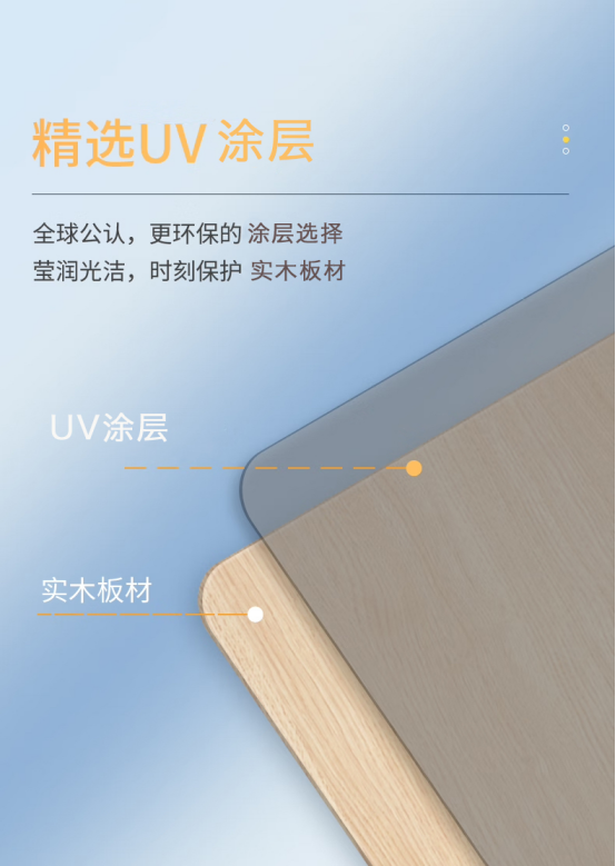 光明园迪Y6系列学习桌表面使用世界“涂装之王”意大利cefla(赛福徕)全自动喷涂线进行UV喷涂,UV镀膜是立体状结构,硬度大,耐磨性好,透明度好,不含任何挥发物质,产品耐刮碰,色彩稳定不褪色;为保留更加清透的木质原始感,光明园迪会经过六面三遍打磨,2次封闭,2次喷涂,从而使保护膜更饱满,纹理更自然,手感更光滑。进行过UV喷涂过的学习桌,漆膜更厚,饱满度高,触感顺滑圆润。