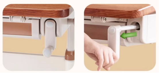 相比侧置前置手摇,光明园迪Y6系列学习桌的前置手摇设计节省了29%的空间;孩子坐在椅子上可以实现整桌升降调节,方便省力;Y6系列学习桌的前置手摇感知度更好,可以调节到更精准的高度;自回收设计防止孩子忘记放回手摇柄而发生磕碰的危险。