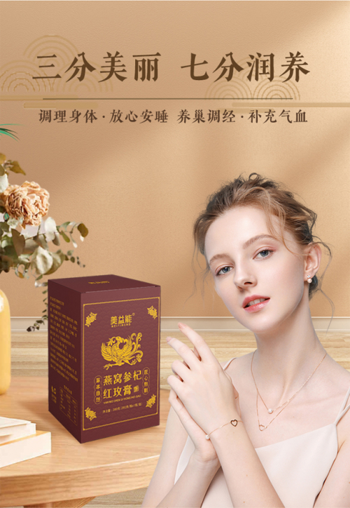 美益能燕窝参杞红玫膏,用18道古法文火慢熬煎煮,地道严选取材,精选人参、燕窝、阿胶、鹿血、蛹虫草、枸杞子、瑰花、海参、蜂蜜等多种珍贵药材。人参具有增强免疫力、提高体力和耐力、减轻疲劳、改善记忆力、降低血糖和胆固醇、抗癌等作用;燕窝具有补肺养阴、止肺虚性咳嗽、滋阴润燥、益气养血、美容养颜等多种功效;蜂蜜、玫瑰具有美容养颜、抗衰防皱功效;枸杞可补气养胃、延缓衰老;阿胶活血化瘀、润肠通便、能改善月经不调;鹿血具有补脾益气、温肾壮阳功效……多种珍贵药材精心熬制,能够有效改善睡不安稳,身体乏力,失眠多梦,月经不调,气血亏淤,面色暗黄,上养颜,中润巢,下调经,具有滋补强身,抗衰延年,调养纠偏等多种问题。可以说是能够满足多种需求,达到补足消耗、养精蓄锐的作用。