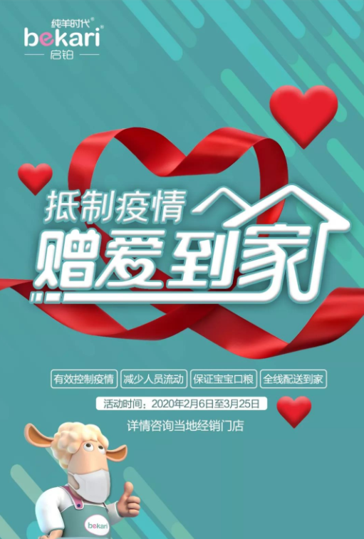 疫情来临时,全体蓓康僖人始终坚守一线,在做好自身防控的同时,全力保障生产和物流、开通上门配送服务等,怀着“为家庭健康,聚全球品质”的使命,确保每一罐蓓康僖纯羊奶粉能够及时、安全地运送至到妈妈手中,为所有宝宝提供健康营养。更有“抵制疫情,我们赠爱到家”活动全新上线。