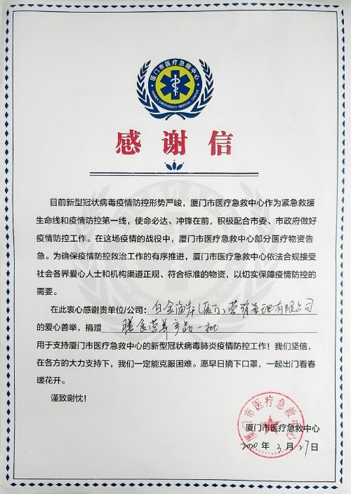 捐赠现场,来自厦门医疗急救中心的林主任向叁佰添表示感谢,并颁发爱心捐赠证书和感谢信。林主任表示,因为时间紧任务重,中心很多工作人员都没能及时吃上饭,这批捐赠物资很及时。