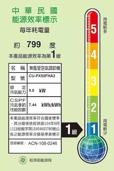 能源效率标示图,以Panasonic国际牌冷气CS-PX50FA2为例。