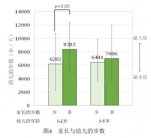 将家长分成步数多的一组和少的一组,分别对其子女的步数进行分析得出,对于1-2岁的幼儿,家长步数多的一组幼儿的步数也相对较多(图4)。原因是这个年龄段的幼儿与3-5岁幼儿相比,多数情况下尚不能独立,活动时多需家长参与,因此亲子间一起活动,可达到增加幼儿活动量的效果。
