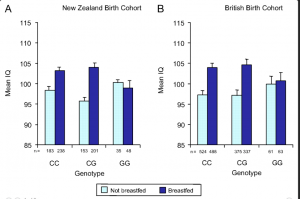 2007年,PNAS上刊登一篇关于母乳和配方奶的国际研究,耶鲁大学等教授以脂肪酸代谢的遗传变异来探讨母乳喂养对智商的影响。研究结果呈现如下图,左图是纽西兰出生的孩子,右图是英国出生的孩子,横轴是基因表现型态,总轴是平均智商分数,深蓝色是喝母乳,淡蓝色是喝配方奶。