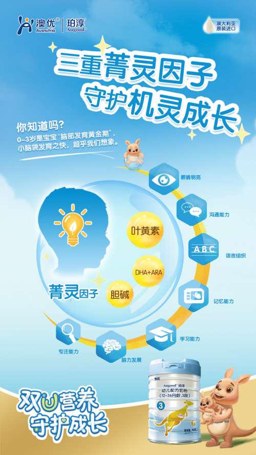 有许多精明的家长在寻找营养丰富的奶粉品牌时发现,珀淳婴幼儿配方奶粉中恰恰含有乳铁蛋白、GOS/FOS、核苷酸这三重博护因子,可以守护宝宝活力成长。与此同时,这款珀淳奶粉还添加了叶黄素、DHA&ARA、胆碱三重菁灵因子。现代医学研究表明,叶黄素是构成视网膜黄斑区域的主要成分,能起到助力宝宝视力发育的作用;DHA和ARA都是脑部和眼部的重要营养组成成分,有助于宝宝视力、大脑发育、认知和学习能力发育;而胆碱在宝宝学习与记忆、自发运动和探究行为等认知活动中,也有着深远影响。正因此,珀淳奶粉用这三重菁灵因子守护宝宝机灵成长。